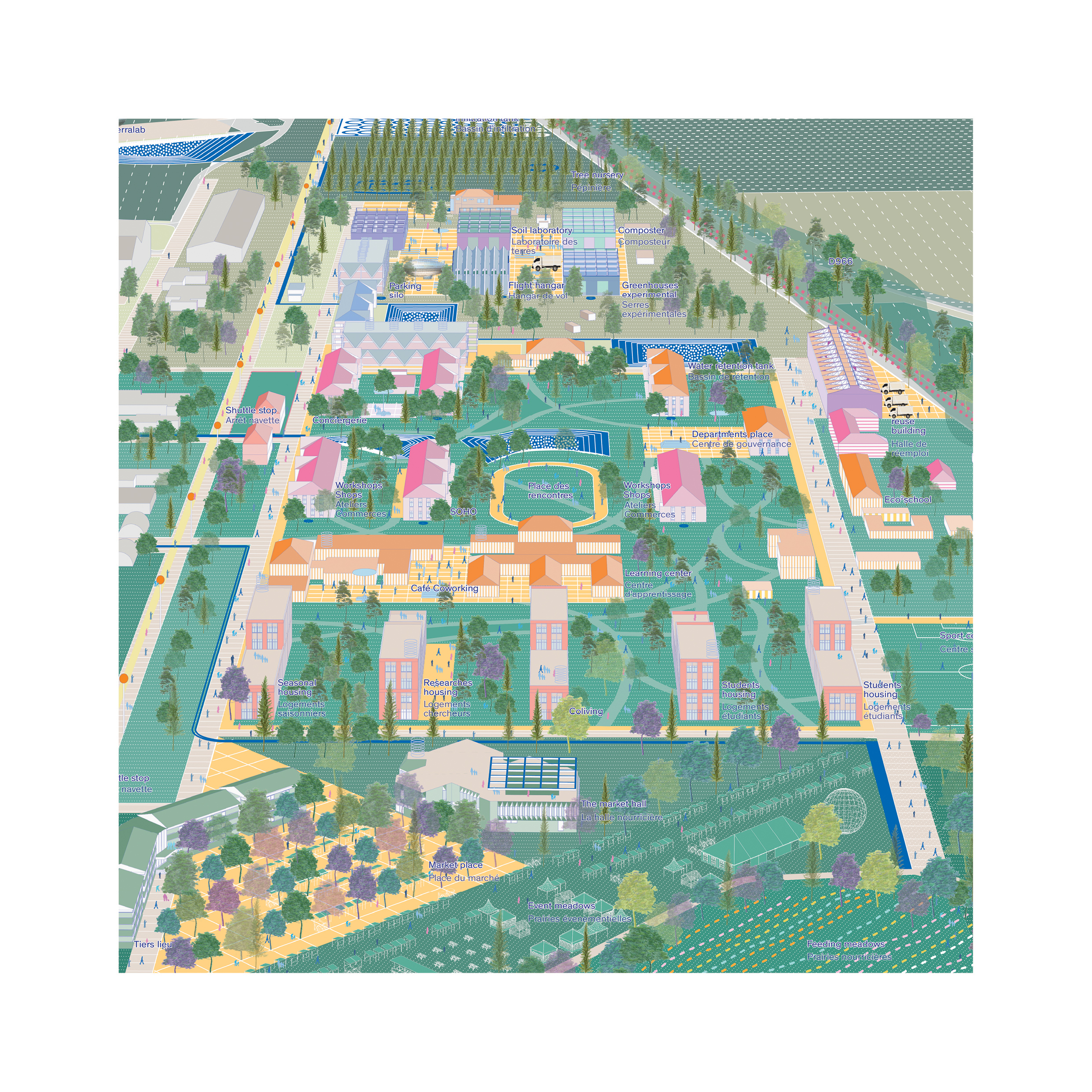 Afin d’organiser la rencontre et créer des synergies inattendues entre une grande multiplicité d’acteurs, trois départements sont créés autour du sol, de l’air et de l’eau. Ils organisent la transition progressive du site en quatre territoires d’expérimentations : le jardin des ressources, les laboratoires, la microville et les prairies expérimentales.
